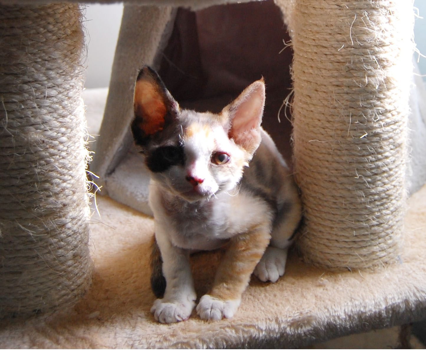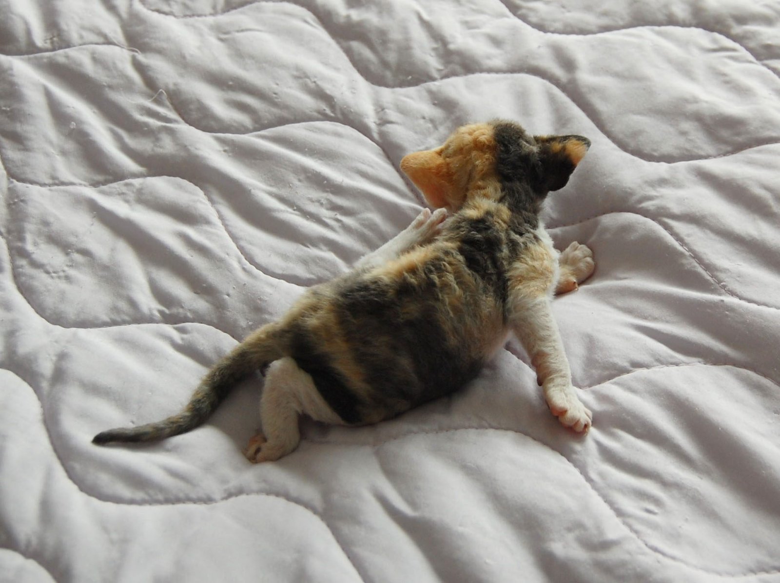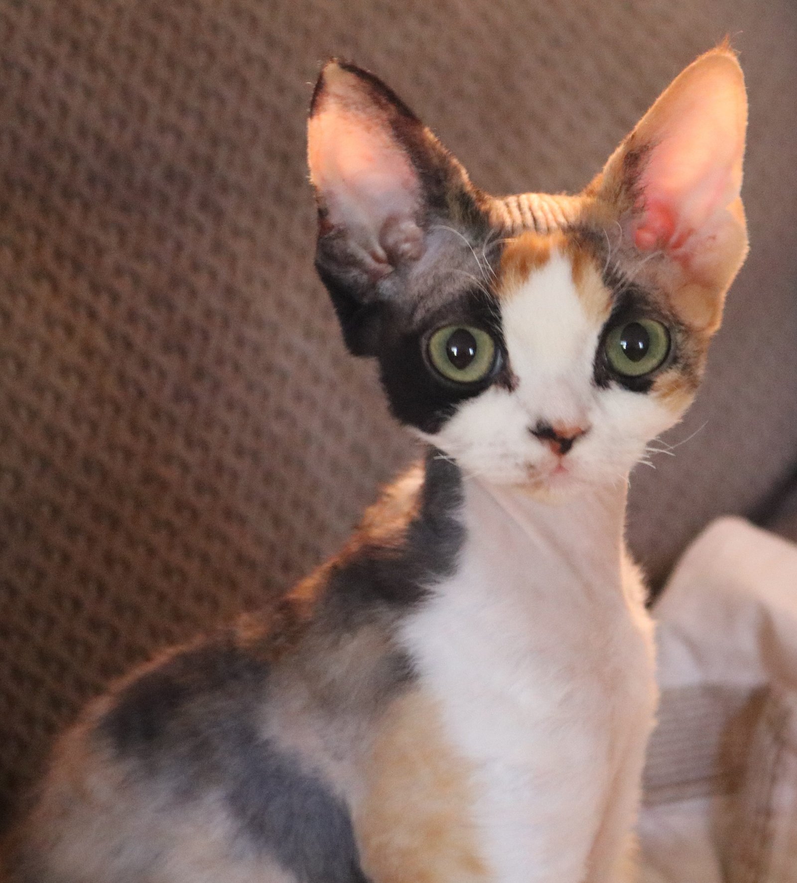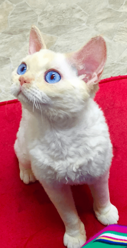5 Devon Rex kittens in a cat bed
